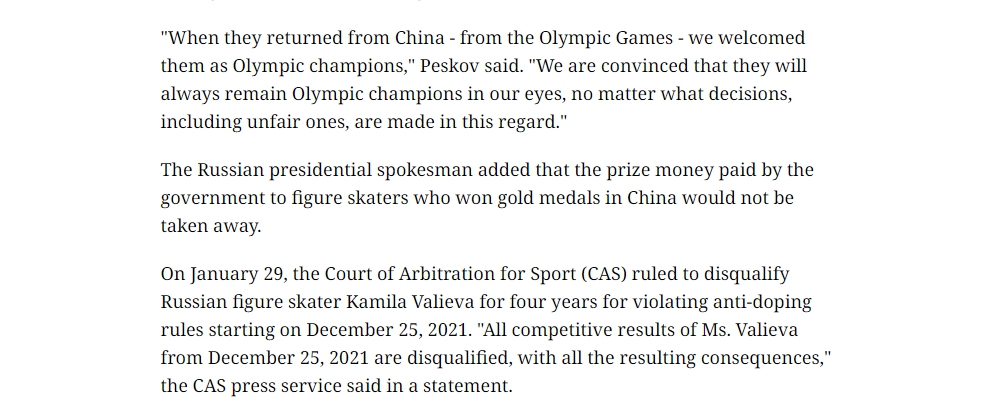 此外,俄羅斯衛(wèi)星通訊社在此前另一篇報(bào)道中稱,俄羅斯總統(tǒng)新聞秘書佩斯科夫表示,被處罰一事是政治化的決定,俄羅斯將提起上訴。佩斯科夫強(qiáng)調(diào)將始終保護(hù)運(yùn)動員的利益。“如果有任何上訴機(jī)制,我們當(dāng)然應(yīng)該使用起來?!?/p>