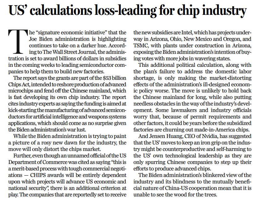 美國失策的經(jīng)濟(jì)政策本已造成市場扭曲,疊加出于政治意圖的算計,以及補貼也無法解決的勞動力短缺問題,這一切只會讓扭曲態(tài)勢進(jìn)一步惡化。此舉不太可能長期遏制中國大陸,但卻給行業(yè)發(fā)展帶來種種不必要的障礙。美國部分國會議員及企業(yè)高管擔(dān)心,受到許可要求及其他因素影響,享受補貼的企業(yè)可能要花費很多年才能生產(chǎn)出美國制造的芯片。