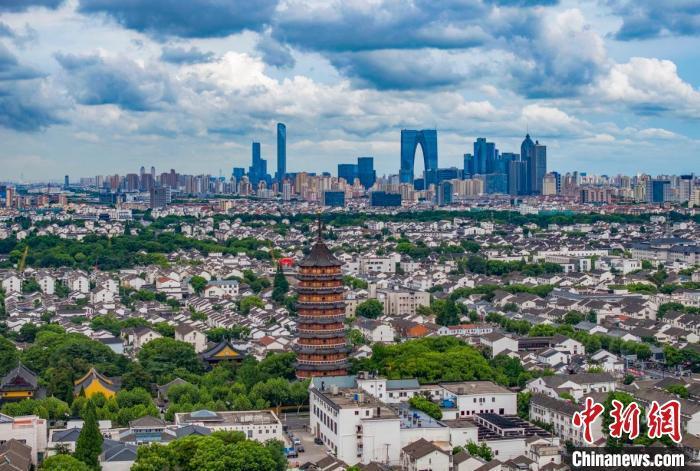 資料圖:蘇州古城近處的北寺塔與遠處的現(xiàn)代樓宇相呼應(yīng)。 泱波 攝