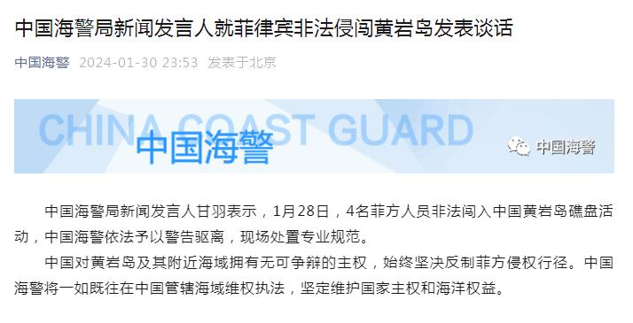 中新網(wǎng)1月31日電 據(jù)中國海警微信公眾號30日消息,中國海警局新聞發(fā)言人甘羽表示,1月28日,4名菲方人員非法闖入中國黃巖島礁盤活動,中國海警依法予以警告驅(qū)離,現(xiàn)場處置專業(yè)規(guī)范。