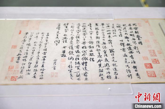 中新網???月1日電 (記者 符宇群)故宮博物院院藏蘇軾真跡《新歲展慶帖》《人來得書帖》合卷1日起在海南省博物館展出,同時展出的還有該院院藏“宋四家”的另外三位——黃庭堅、米芾、蔡襄作品。