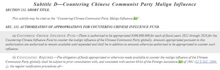 具體內(nèi)容為:“授權(quán)在2022年至2026年的每個(gè)財(cái)政年度,為‘對抗中國影響力基金’撥款3億美元,以對抗中國共產(chǎn)黨在全球的惡意影響?!?/p>