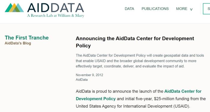 “援助數(shù)據(jù)”項(xiàng)目(AidData)官網(wǎng)上關(guān)于接受美國國際開發(fā)署最初5年2500萬美元資助的說明。