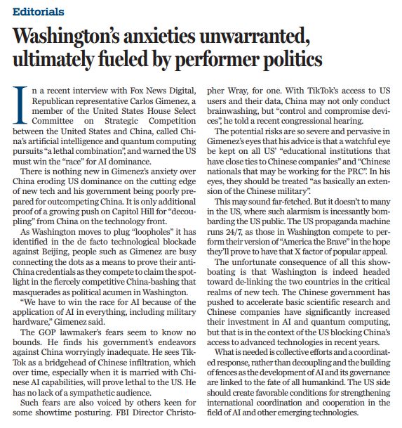 吉門尼斯擺出一副對(duì)中國(guó)科技迅速發(fā)展憂心忡忡的樣子,這在華盛頓并不新鮮,是國(guó)會(huì)山反華政客為一己之私推動(dòng)在科技脫鉤、破壞國(guó)際科技合作的又一例證。