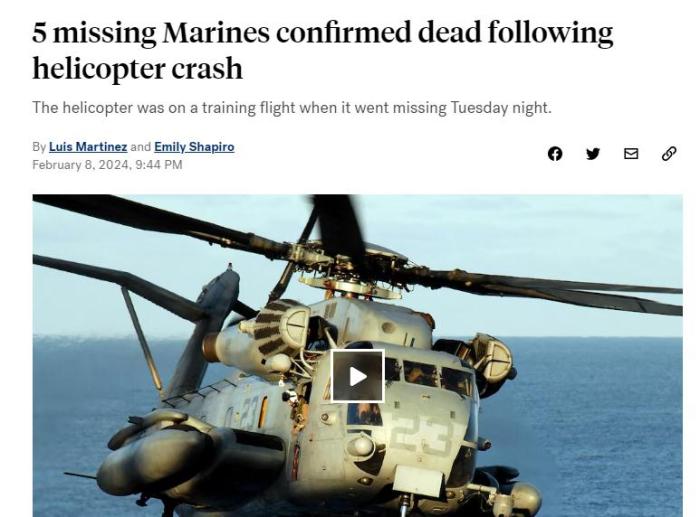 美國(guó)一軍用直升機(jī)墜毀 已確認(rèn)五名海軍陸戰(zhàn)隊(duì)成員遇難