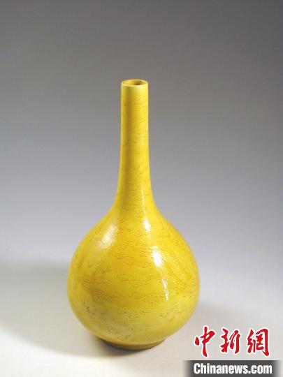 據(jù)沈陽故宮博物院研究館員李曉麗介紹,龍紋在發(fā)展過程中經(jīng)常和吉祥紋飾組合到一起。如清康熙款黃釉錐把瓶的口沿以下器身滿飾錐拱紋飾,暗刻流云、火焰圖案,瓶腹中部暗刻一龍一鳳形象,相向而飛,寓意“龍鳳呈祥”。腹下部近足處,有一圈海水紋飾?!斑@種暗刻紋龍鳳、流云、海水圖案,在康熙、雍正兩朝較為盛行?!?/p>