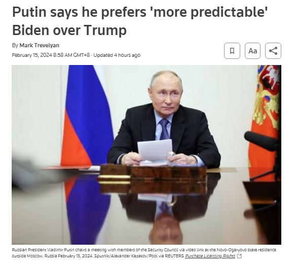 據(jù)報(bào)道,這是普京首次公開(kāi)評(píng)論2024年美國(guó)大選。當(dāng)被問(wèn)及兩人誰(shuí)當(dāng)選對(duì)俄羅斯“更有利”時(shí),普京回應(yīng):“拜登,他更有經(jīng)驗(yàn)、更有預(yù)見(jiàn)性,是一位老派政治家?!?/p>
