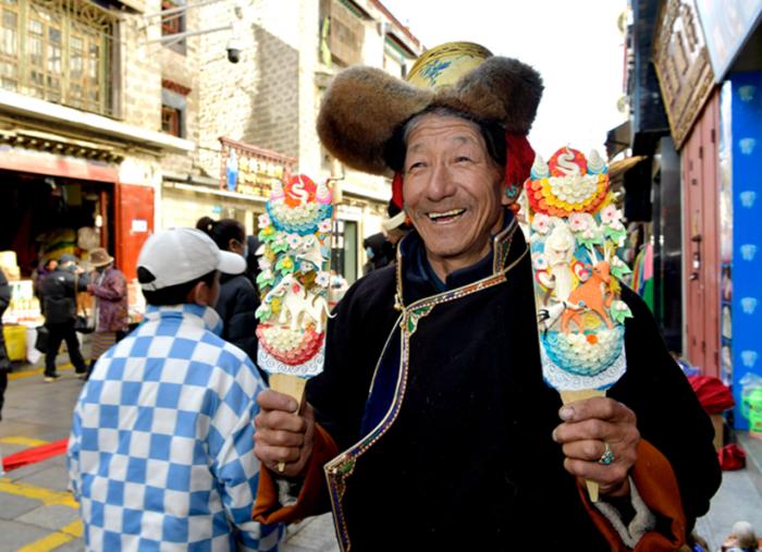 圖為:藏族老大爺手里拿著五彩酥油花“孜珠” 中新社記者 李林攝