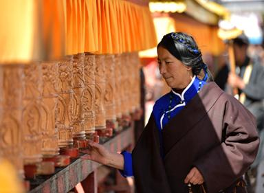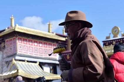 圖為八廓街轉經(jīng)的藏族老阿爸老阿媽。中新社記者李林攝