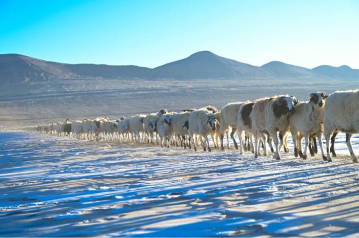 圖為普莫雍錯藍冰上羊群前往湖心島 。中新社記者 趙朗 攝