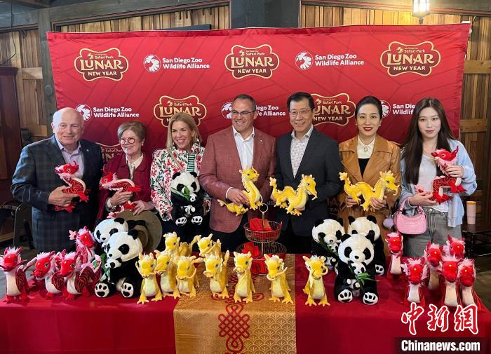 當(dāng)天上午,印著祥龍圖案的紅燈籠、結(jié)滿果實的金桔樹和鮮花盛放的桃樹將圣地亞哥野生動物園裝點一新。中國駐洛杉磯總領(lǐng)事郭少春及夫人王薇、美國圣地亞哥動物園野生動植物聯(lián)盟總裁兼首席執(zhí)行官潘禮邦(Paul Baribault)與首席市場官穆德威(David Miller)等中美各界人士齊聚一堂,同當(dāng)?shù)馗髯逡崦癖姽蚕泶汗?jié)的喜悅。