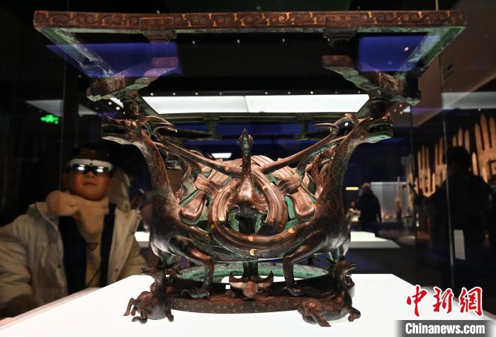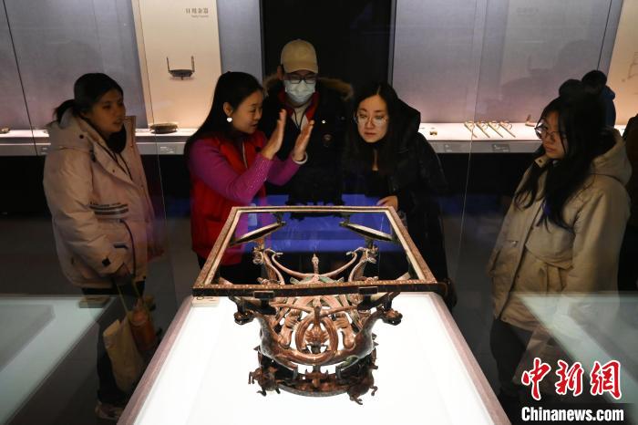 2月6日,民眾在河北博物院“戰(zhàn)國雄風(fēng) 古中山國”展廳參觀錯金銀四龍四鳳銅方案座?!≈行律缬浾?翟羽佳 攝