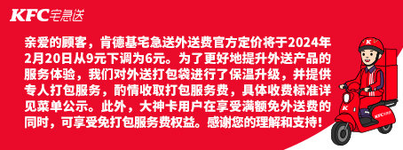 肯德基官網(wǎng)顯示,肯德基宅急送外送費(fèi)官方定價將于2024年2月20日從9元下調(diào)為6元。同時,肯德基稱,為了更好地提升外送產(chǎn)品的服務(wù)體驗(yàn),對外送打包袋進(jìn)行了保溫升級,并提供專人打包服務(wù),酌情收取打包服務(wù)費(fèi)。此外,大神卡用戶在享受滿額免外送費(fèi)的同時,可享受免打包服務(wù)費(fèi)權(quán)益。