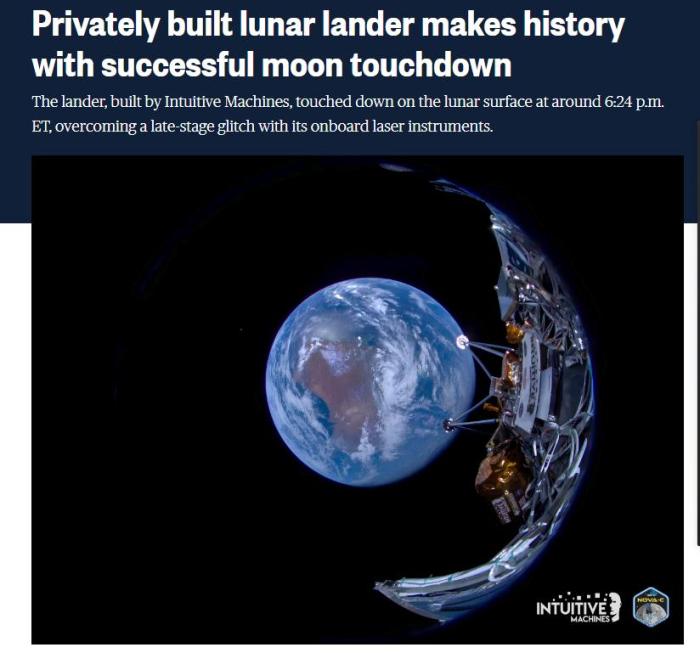 據(jù)報道,由“直覺機(jī)器” 研發(fā)的著陸器于美東時間下午6點(diǎn)23分左右降落在月球表面。該著陸器是自1972年“阿波羅17號”任務(wù)以來第一艘登上月球的美國航天器。