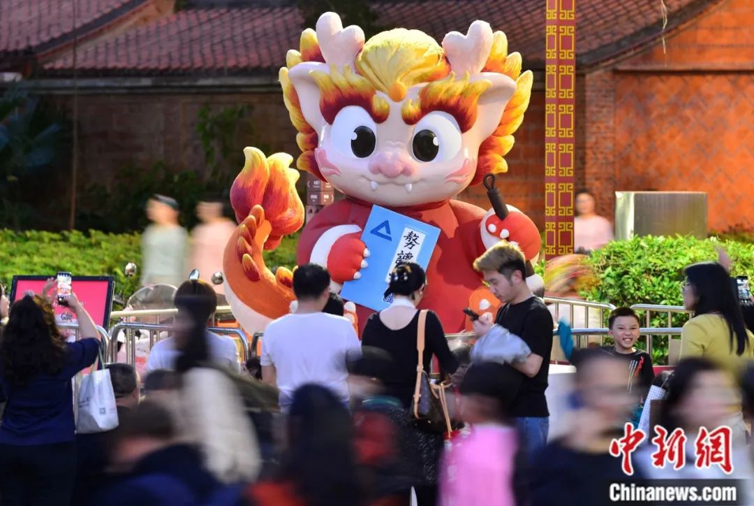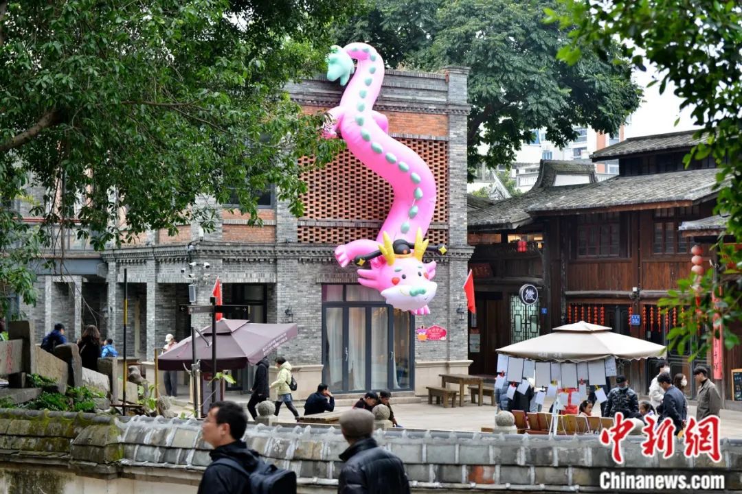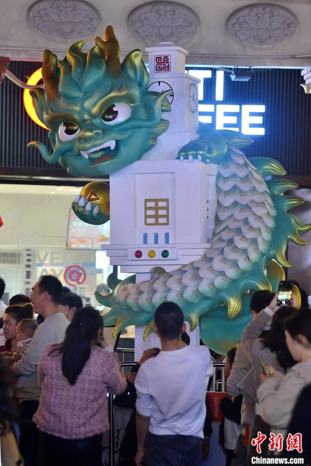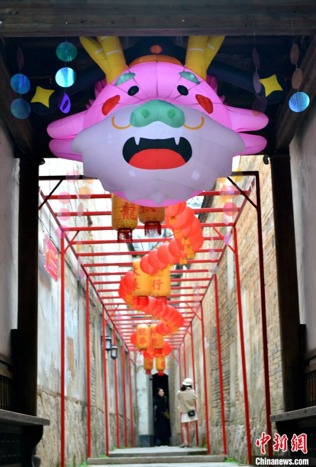 “龍元素”藝術(shù)主題裝置亮相福州上下杭歷史文化街區(qū),活潑的造型與古厝形成鮮明對比。中新社記者 呂明 攝