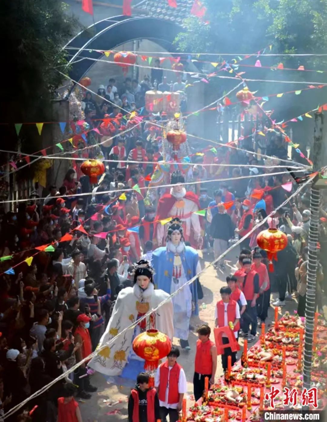 每年正月初十及正月二十六,潭頭鎮(zhèn)厚福村都會舉行傳統(tǒng)游神民俗活動,至今已有400多年的歷史。圖為傳統(tǒng)游神民俗活動中的巡游隊伍簇擁著挺神將的人走街串巷。中新社記者 呂明 攝