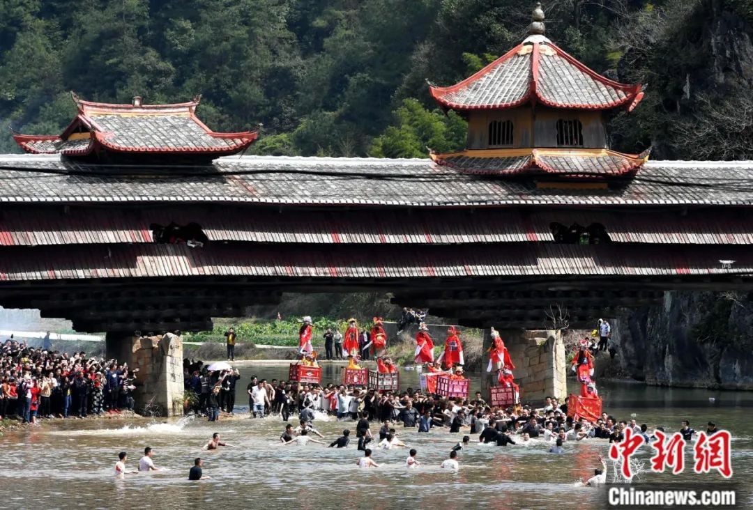 圖為村民抬著“古事棚”行進在小河中。中新社記者 張斌 攝
