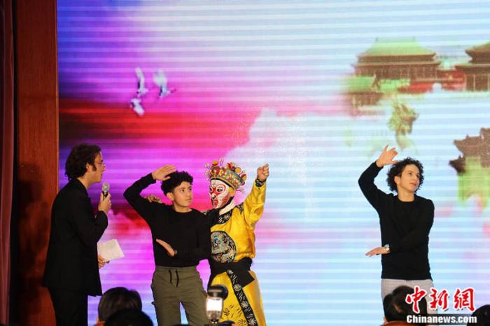 戲曲名段表演、法語(yǔ)經(jīng)典歌曲串燒……你方唱罷我登場(chǎng),中法青年在文藝表演中秀出各自的文化風(fēng)采。由中國(guó)戲曲學(xué)院學(xué)生代表帶來(lái)的民族器樂(lè)演奏、經(jīng)典戲曲名段聯(lián)唱獲得了臺(tái)下的陣陣喝彩。在京劇片段《大鬧天宮》表演結(jié)束后,法國(guó)少年受邀與孫悟空扮演者互動(dòng)。