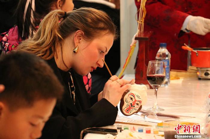 法國(guó)青年在迷你廟會(huì)活動(dòng)繪制臉譜。中新網(wǎng)黃方 攝