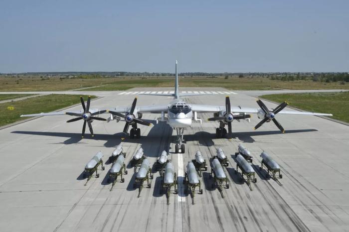 俄一架圖-95MS轟炸機前擺放著14枚導彈。圖片來源:俄羅斯國防部