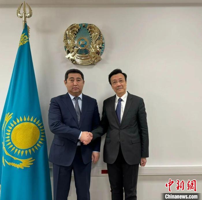 當(dāng)?shù)貢r(shí)間3月4日,大使張霄(右一)會(huì)見哈農(nóng)業(yè)部長薩帕羅夫。中國駐哈薩克斯坦大使館供圖