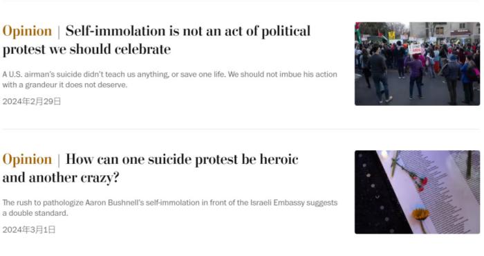 實際上,因為布什內(nèi)爾在直播中的話有非常多的政治標簽,標題想要體現(xiàn)自焚事件的原因本來是非常容易的。但在西方主流媒體的報道標題中,最能直觀表明布什內(nèi)爾行為原因的三個關(guān)鍵詞——“加沙”(Gaza)“種族滅絕”(genocide)乃至“抗議”(protest)字樣均未出現(xiàn)。