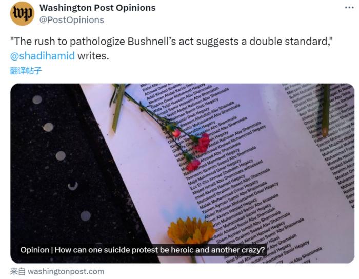 要知道,去年12月就已經(jīng)有美國人在以色列駐亞特蘭大領事館門口,拿著巴勒斯坦國旗自焚抗議,而這位女士至今沒有報道提到過她的姓名。很可能布什內(nèi)爾這次事件的策劃,是吸取過亞特蘭大自焚案教訓的。即便如此,他也躲不過惡意的編排。