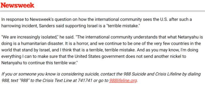 另一家媒體《新聞周刊》,現(xiàn)在則會在每一篇有關(guān)布什內(nèi)爾的文章文末附上預防自殺熱線的信息。比如下面這篇文章只是關(guān)于美國左翼議員伯尼·桑德斯對布什內(nèi)爾事件的評論,內(nèi)容跟布什內(nèi)爾本人其實無甚關(guān)系,也要附上這么一段……