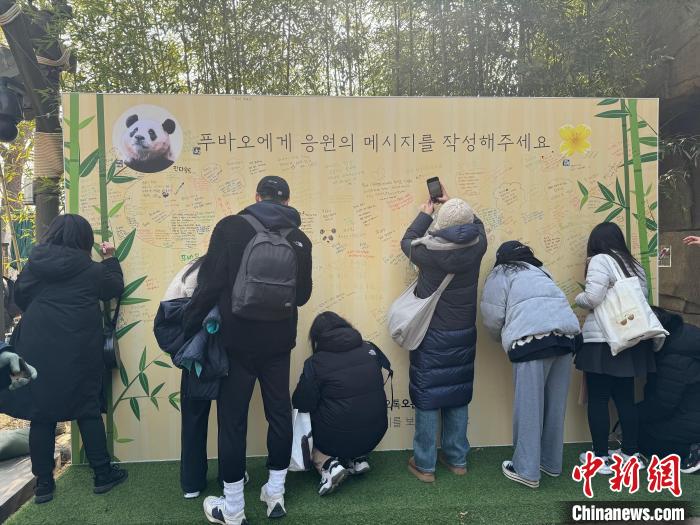 熊貓世界外設有一塊大型留言板供游客留言。記者看到板上有用圓珠筆畫的大熊貓形象,還有用韓語寫的留言:“福寶,有你真好!”“希望我家孩子幸福,永遠健康!”“我愛你福寶,祝你永遠幸福!”