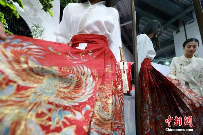 圖為顧客正在挑選、試穿馬面裙。梁犇 攝
