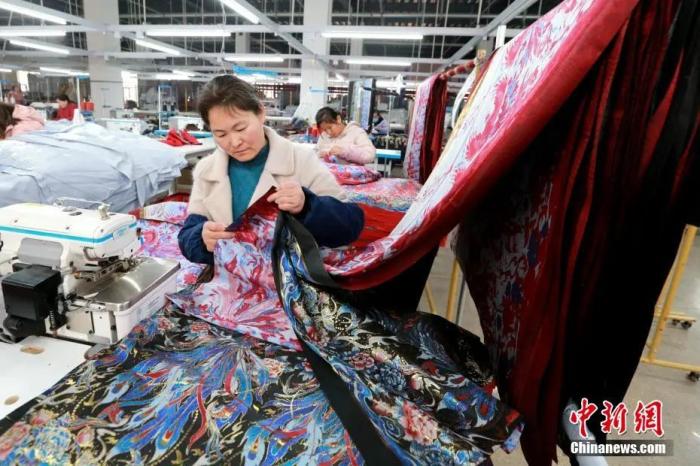 工人將剪裁好的布料進(jìn)行拼接縫制。梁犇 攝
