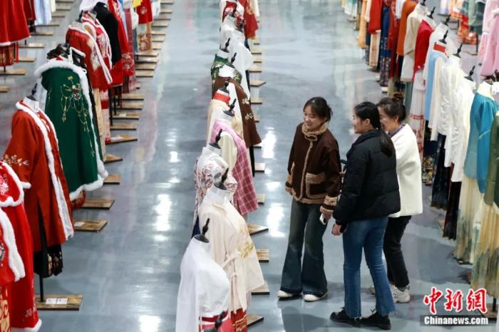 曹縣漢服協(xié)會(huì)會(huì)長(zhǎng)胡春青介紹說,目前,曹縣生產(chǎn)漢服的企業(yè)有2282家,預(yù)計(jì)整個(gè)春節(jié)期間曹縣拜年服銷售額將超過4億元。