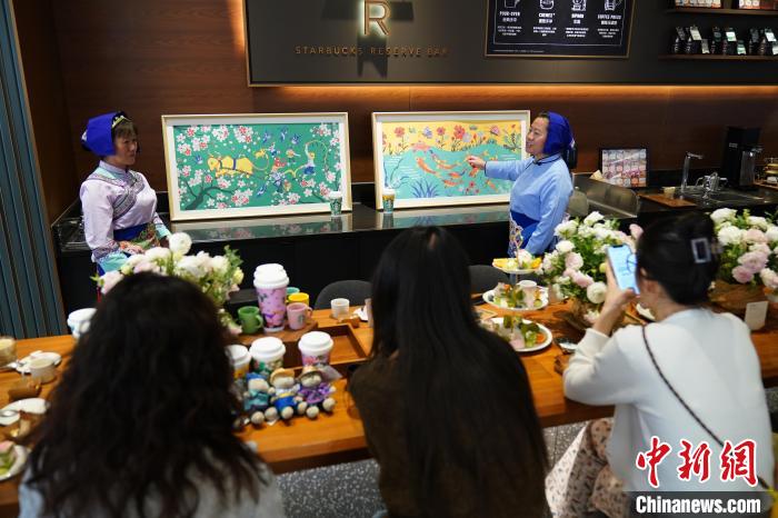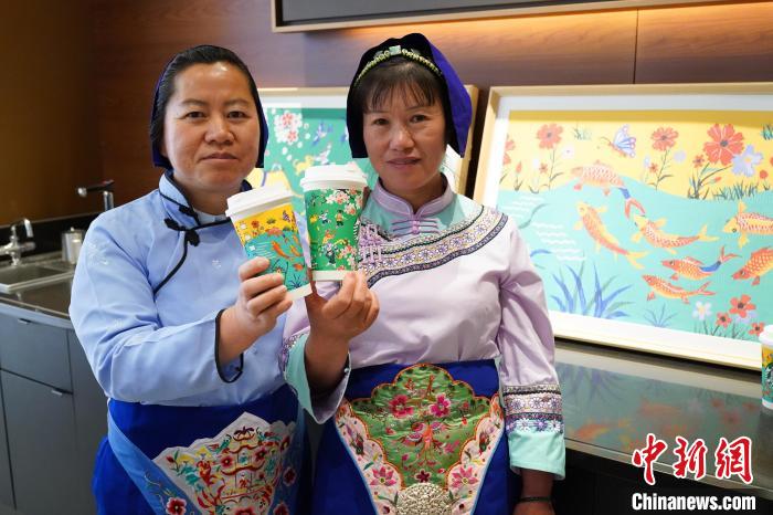 圖為農(nóng)民畫(huà)家展示她們被印在星巴克咖啡紙杯上的畫(huà)作。中新網(wǎng)記者 劉冉陽(yáng) 攝