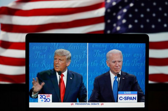 這張2020年10月22日在美國(guó)弗吉尼亞州阿靈頓拍攝的視頻畫(huà)面顯示,時(shí)任美國(guó)總統(tǒng)特朗普(左)與當(dāng)時(shí)的民主黨總統(tǒng)候選人拜登在田納西州納什維爾市參加最后一場(chǎng)總統(tǒng)候選人電視辯論。新華社記者 劉杰 攝