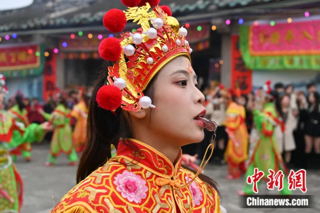 2023年2月9日,廣東潮州,潮陽西門女子英歌隊亮相仙都鄉(xiāng)媽祖文化巡游活動。陳楚紅 攝