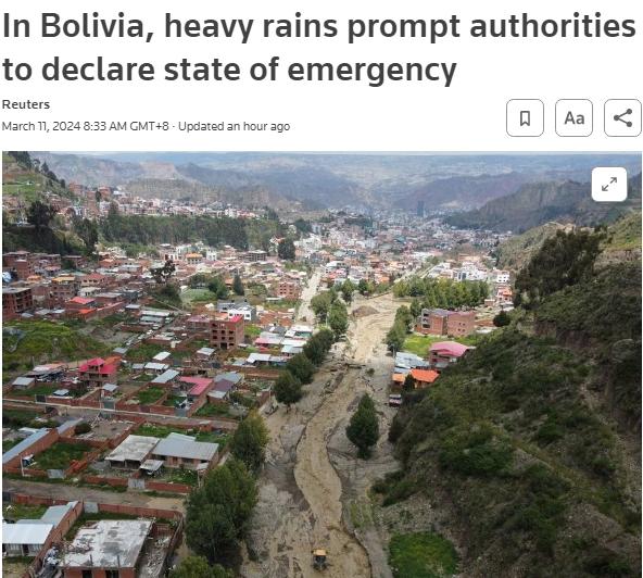 據(jù)報道,玻利維亞當局當天在文件中稱,大雨導致多個社區(qū)和城市偏遠地區(qū)發(fā)生洪災,導致水、電和道路中斷。