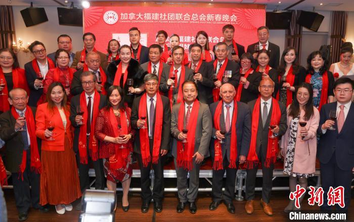 當(dāng)?shù)貢r間3月8日晚,加拿大福建社團(tuán)聯(lián)合總會在多倫多舉辦2024甲辰龍年迎春團(tuán)拜會。圖為該會理事會成員與主要嘉賓共同祝酒?!≈行戮W(wǎng)記者 余瑞冬 攝