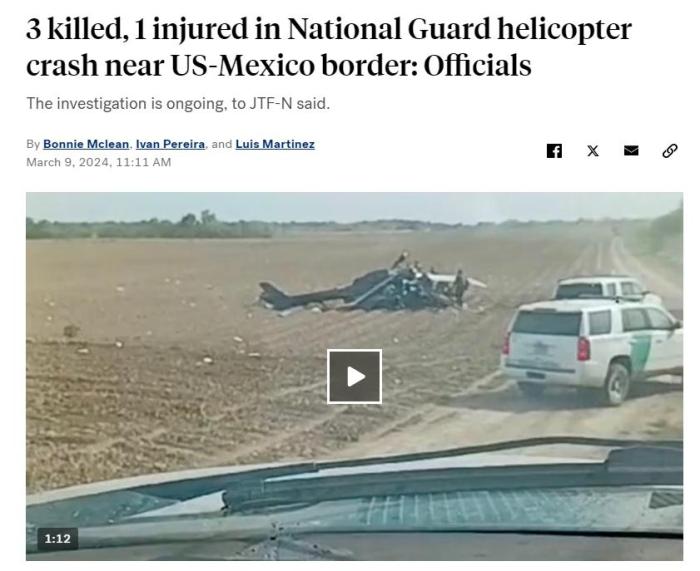 美國(guó)國(guó)民警衛(wèi)隊(duì)直升機(jī)在美墨邊境附近墜毀 致3人死亡