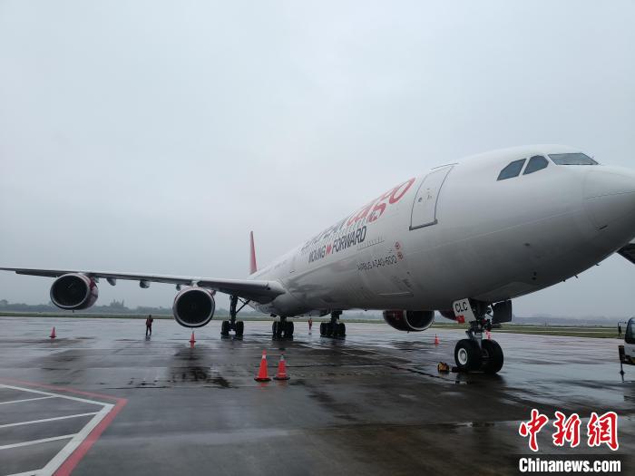 3月9日,由英國伯恩茅斯國際機(jī)場(chǎng)起飛的國際貨運(yùn)航班抵達(dá)海口。(海口美蘭國際機(jī)場(chǎng)供圖)