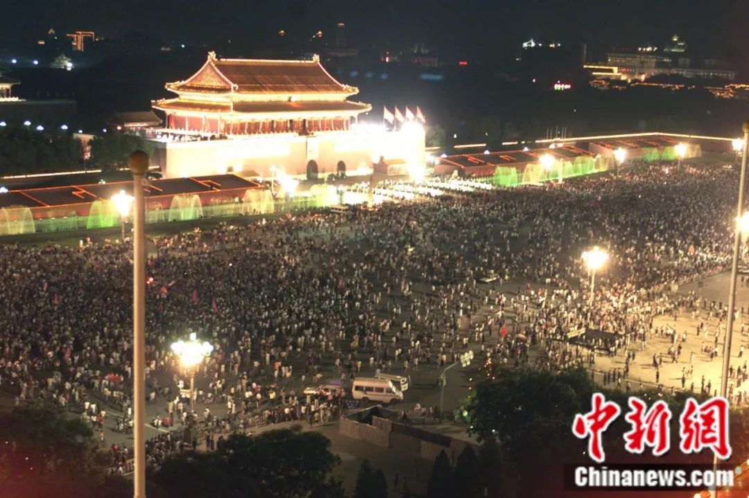 2001年7月13日晚,北京天安門廣場人潮涌動,數(shù)以十萬計的民眾徹夜不眠慶祝北京申奧成功。毛建軍 攝
