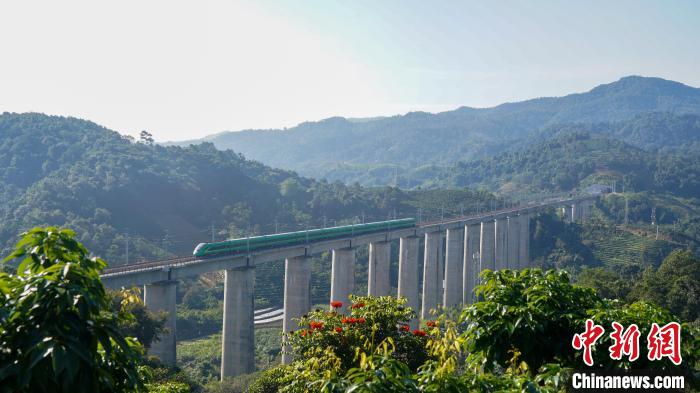 3月17日,一列動(dòng)車(chē)組列車(chē)行駛在中老鐵路上。 吳猛 攝
