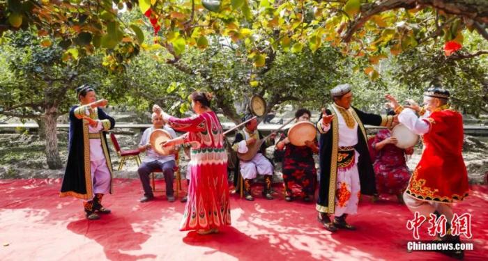 香梨成熟的季節(jié),當?shù)卮迕裣灿憷娉墒欤瑲g快起舞。姚謙 攝
