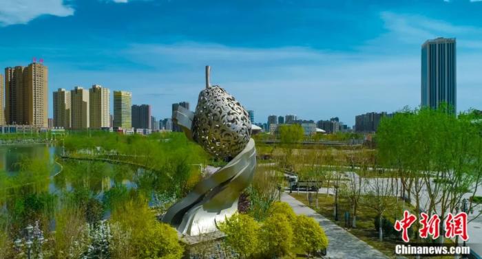 庫爾勒天鵝河畔孔“庫爾勒香梨雕塑”。 文興華攝