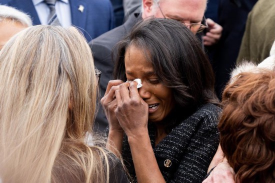 2023年1月6日,在美國首都華盛頓的國會大廈外,一名前國會警察遺孀在紀念“國會山騷亂”兩周年紀念儀式上流淚。新華社記者 劉杰 攝