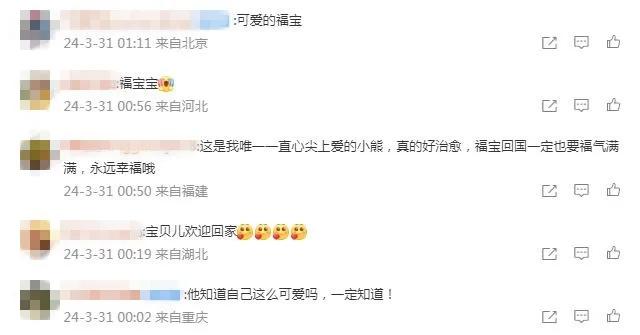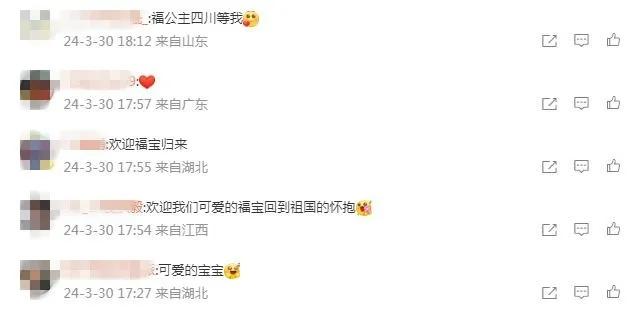有網(wǎng)友寫道,祝愿“福寶”一切順利,“能很快適應(yīng)新環(huán)境”。還有網(wǎng)友表示,“福寶回國(guó)后一定也要福氣滿滿,永遠(yuǎn)幸福哦!”