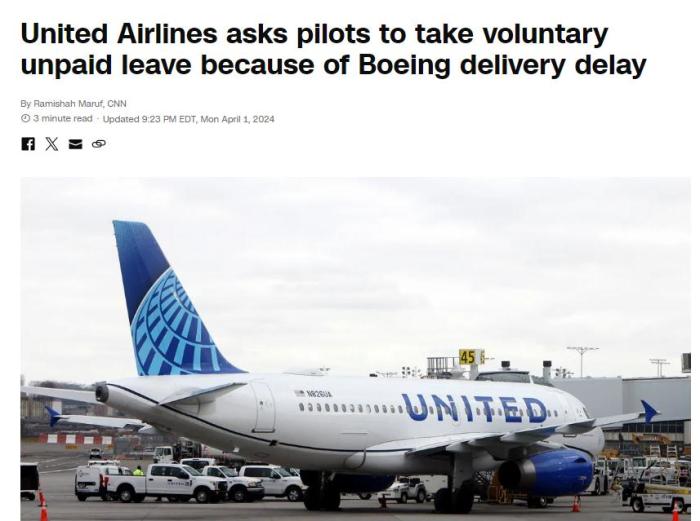 據(jù)美國(guó)消費(fèi)者新聞與商業(yè)頻道(CNBC)報(bào)道,美聯(lián)航證實(shí)了無(wú)薪休假的請(qǐng)求。該航空公司此前還表示,由于波音公司的飛機(jī)延遲交付,它將在2024年春天暫停招聘飛行員。