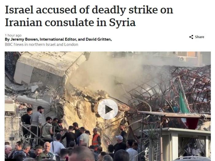 報道援引伊朗駐敘利亞大使侯賽因·阿克巴里的話稱,伊朗大使館旁邊的領事部門建筑“遭到以色列F-35戰(zhàn)機發(fā)射的六枚導彈襲擊”。伊朗媒體發(fā)布的視頻還顯示,現(xiàn)場遭到嚴重破壞,并起火冒煙。
