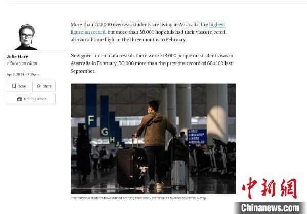 澳大利亞政府最新數(shù)據(jù)顯示,截至今年2月的三個月內(nèi),有超過5萬名申請簽證的留學生被拒。圖片來源于《澳大利亞金融評論》網(wǎng)站截圖。