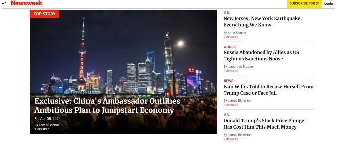 據(jù)中國駐美國大使館網(wǎng)站消息,4月5日,中國駐美國大使謝鋒就“新質(zhì)生產(chǎn)力”和中國經(jīng)濟(jì)形勢接受美國《新聞周刊》(Newsweek)高級外交政策記者湯姆·奧康納專訪,訪談內(nèi)容當(dāng)日在該周刊網(wǎng)站刊登。