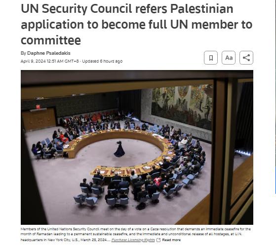 中新網(wǎng)4月9日電 據(jù)路透社報(bào)道,當(dāng)?shù)貢r(shí)間4月8日,聯(lián)合國安理會(huì)將巴勒斯坦成為聯(lián)合國正式會(huì)員國的申請?zhí)峤话怖頃?huì)新成員接納委員會(huì)。